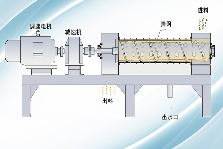 酒糟脫水機是通過機械外力擠壓及壓榨把酒糟中的液體分離出去,留下固體物質,原理如下需脫水的物料從進料口進入擠壓機,物料被錐型螺旋擠壓脫水后,送至出料口,其大部分的水份從篩板濾出。從而達到脫水的目的。脫水后的物料可直接進干燥機進行干燥。對于物料品種的不同和產量的變化可通過調整擠壓機轉速實現,達到脫水效果和產量的配合。調速電動機運轉正常后物料從進料箱均勻加入進機后的物料在螺旋旋轉葉片推動下沿軸向前進前進過程中物料受變化的螺距和調節檔板的作用形成巨大 的擠壓力使物料在外力作用下進行機械脫水水份通過篩網在出水口處排出脫水后的物料在出料箱處排出。