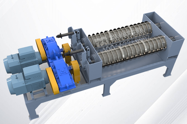 高濕物料通過螺旋上料機進入擠壓機,物料被錐型螺旋擠壓脫水后,送至出料口,其大部分的水份從篩板濾出。