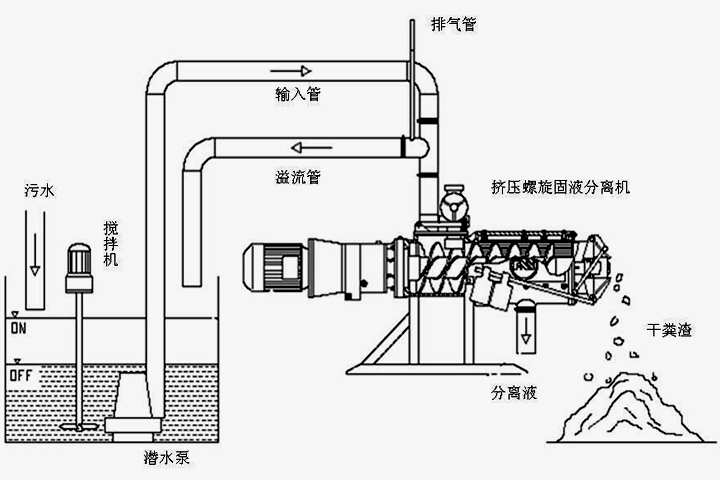 用設(shè)備配套的無堵塞液下泵將牛糞水抽送至牛糞固液分離機(jī)內(nèi),再由絞龍將牛糞水逐漸推向機(jī)器的前方,同時(shí)不斷提高機(jī)器前緣的壓力,迫使物料中的水分在邊壓帶 濾的作用下擠出網(wǎng)篩,流出排水管。牛糞固液分離機(jī)的工作是連續(xù)進(jìn)行的,其牛糞水不斷的提升至牛糞固液分離機(jī)體內(nèi),前緣的壓力不斷增大,當(dāng)大到一定程度時(shí), 就將出料口頂開并擠出擠壓口,達(dá)到擠壓出料的目的。為了掌握出料的速度與含水量, 可以調(diào)節(jié)主機(jī)下方的配重塊,以達(dá)到適當(dāng)?shù)某隽蠣顟B(tài)。如果抽入牛糞水過多,會(huì)經(jīng)溢液管排到原牛糞水池,經(jīng)螺旋擠壓過濾分離出的牛糞廢水可直接派送至沼氣 池發(fā)酵沼氣或排送至其廢水沉淀池等。