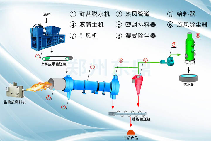 滸苔烘干機生產線主要由壓榨脫水設備、熱源、上料機、進料機、干燥主機 、出料機、引風機、卸料器和配電柜、粉碎系統、打包系統等部件構成;具體工藝如下水分含量高達80%以上的濕滸苔經壓榨脫水系統擠壓脫水后水分降到65%左右,然后經螺旋上料機進入干燥系統,在干燥滾筒內均布的抄板翻動下,進行均勻分散與熱空氣充分接觸,加快了烘干傳熱、傳質。在烘干過程中,物料在帶有傾斜度的抄板和熱介質的作用下,至烘干機星形卸料閥排出烘干成品。