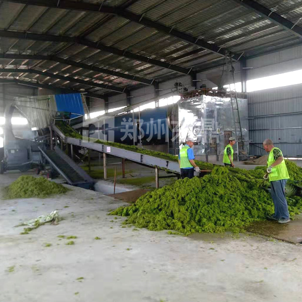 3、滸苔烘干工序:由于滸苔的變質速度非常快,離開海水的滸苔半天就會發臭,所以被運到車間的滸苔必須快速烘干處理,烘干系統采用東鼎大型三環烘干機系統,可以快速將滸苔水分降至臨界水分,便于儲存